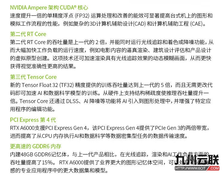 解锁新一代革命性设计、科学突破和身历其境的娱乐体验,NVIDIA® RTXTM A6000 为桌上型工作站提供全球最强大的视觉运算 GPU。RTX A6000 顶尖的效能与功能让你能以惊人的速度工作,满足现今迫切的需求,并准备好迎接未来发展快速、运算密集的任务。